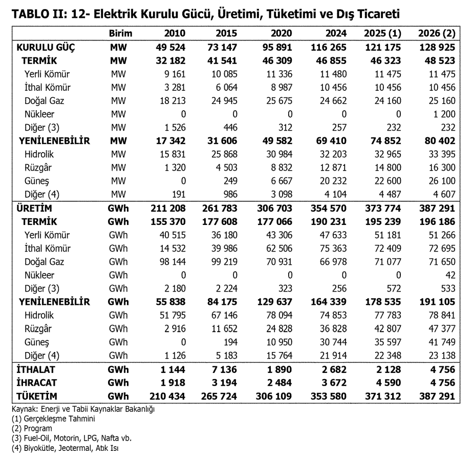 30 Ekim 2025 tarihinde Resmî Mükerrer Gazete’de yayımlanan 10525 karar sayılı, 2026 Yılı Cumhurbaşkanlığı Yıllık Programına göre, 2026 yılı sonunda Türkiye’nin kurulu gücü 128.925 MW’a ve güneş enerjisi kurulu gücünün de 26.100 MW’a ulaşacağı öngörülüyor.