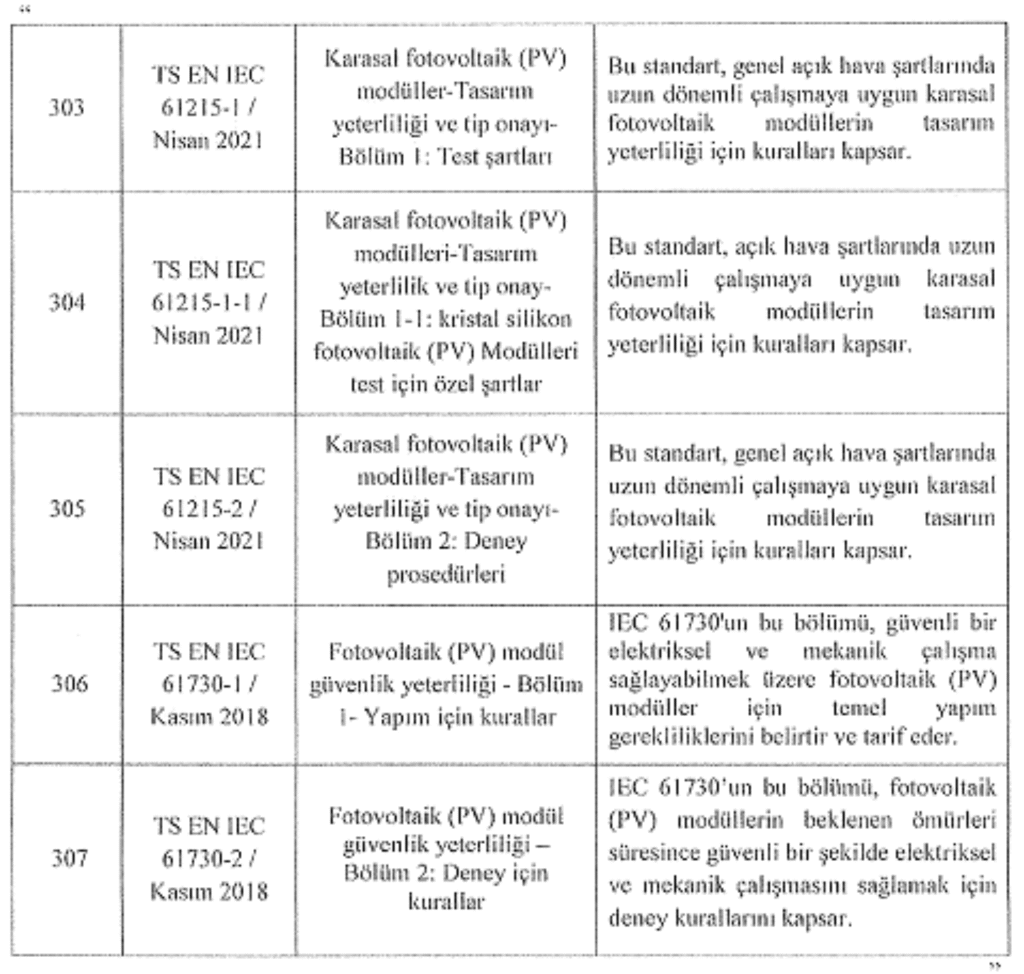 Resmi Gazete’de yayımlanan düzenlemeye göre, fotovoltaik modüllerin imalat ve piyasaya arz süreçlerinde aşağıdaki Türk standartları zorunlu olacak: