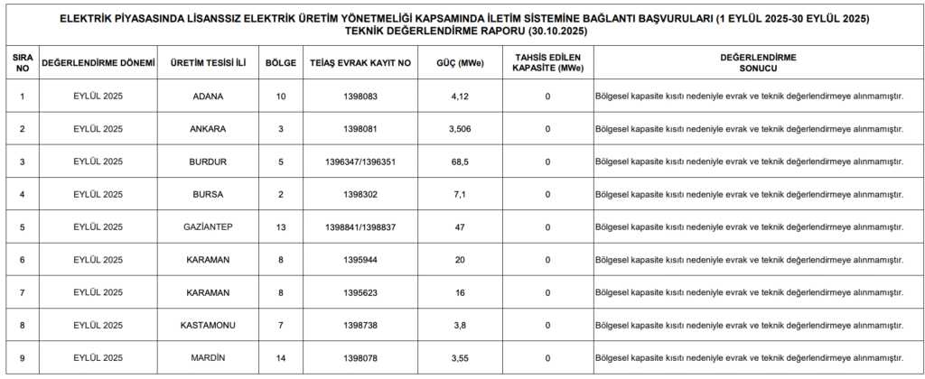 TEİAŞ tarafından yayımlanan “1 Eylül – 30 Eylül 2025 Teknik Değerlendirme Raporu”nda, lisanssız üretim yönetmeliği kapsamında yapılan tüm başvuruların reddedildiği görüldü. Red gerekçesi ise net: